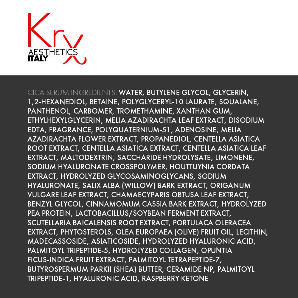 CREAM: Water, Glycerin, Cyclopentasiloxane, HydrogenatedPolydecene, DipropyleneGlycol, Cyclohexasiloxane, PentaerythritylTetraethylhexanoate, Triethylhexanoin, Bis-PEG-18 MethylEtherDimethylSilane, 1,2-Hexanediol, StearylAlcohol, GlycerylStearate, ButyleneGlycol, PEG-100 Stearate, Dimethicone, CetearylOlivate, Betaine, Panthenol, SorbitanStearate, SorbitanOlivate, CetylAlcohol, PalmiticAcid, StearicAcid, Dimethicone/VinylDimethiconeCrosspolymer, Menthol, Tromethamine, TocopherylAcetate, MenthylLactate, XanthanGum, Carbomer, Acrylates/C10-30 AlkylAcrylateCrosspolymer, Ethylhexylglycerin, MyristylAlcohol, MeliaAzadirachtaLeafExtract, Fragrance, DisodiumEDTA, Allantoin, LaurylAlcohol, Adenosine, MeliaAzadirachtaFlowerExtract, Limonene, ArachidicAcid, BHT, TripropyleneGlycol, SodiumHyaluronate, LauricAcid, OleicAcid, MyristicAcid, Propanediol, Maltodextrin, SaccharideHydrolysate, PropyleneGlycol, CentellaAsiaticaRootExtract, CentellaAsiaticaExtract, CentellaAsiaticaLeafExtract, HouttuyniaCordataExtract, SodiumHyaluronateCrosspolymer, HydrolyzedGlycosaminoglycans, ChamaecyparisObtusaLeafExtract, SalixAlba (Willow) BarkExtract, OriganumVulgareLeafExtract, BenzylGlycol, CinnamomumCassiaBarkExtract, HydrolyzedPeaProtein, Lactobacillus/SoybeanFermentExtract, ScutellariaBaicalensisRootExtract, PortulacaOleraceaExtract, Phytosterols, Squalane, Lecithin, OleaEuropaea (Olive) FruitOil, HydrolyzedHyaluronicAcid, PalmitoylTripeptide-5, OpuntiaFicus-IndicaFruitExtract, HydrolyzedCollagen, Asiaticoside, Madecassoside, PalmitoylTetrapeptide-7, CeramideNP, ButyrospermumParkii (Shea) Butter, PalmitoylTripeptide-1, HyaluronicAcid, RaspberryKetone