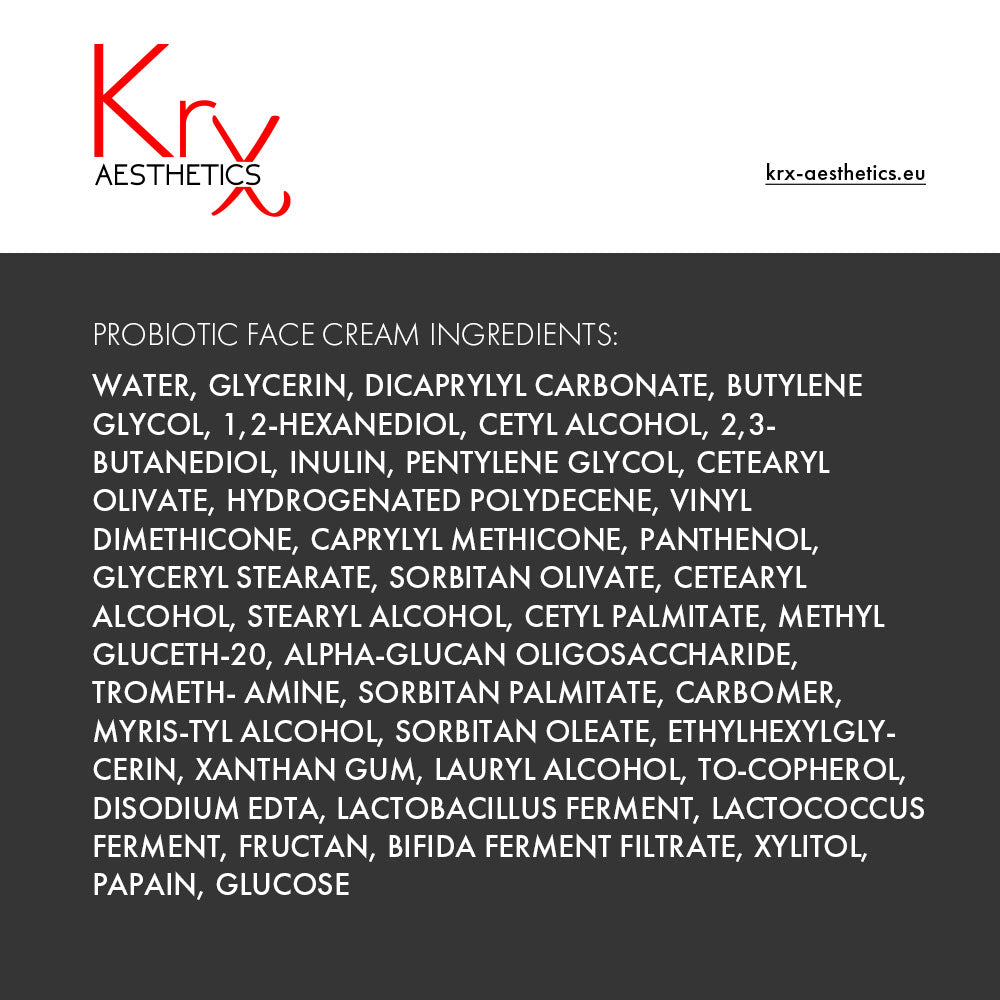 PROBIOTIC FACE CREAM: Water, Glycerin, Dicaprylyl Carbonate, Butylene Glycol, 1,2-Hexanediol, Cetyl Alcohol, 2,3- Butanediol, Inulin, Pentylene Glycol, Cetearyl Olivate, Hydrogenated Polydecene, Vinyl Dimethicone, Caprylyl Methicone, Panthenol, Glyceryl Stearate, Sorbitan Olivate, Cetearyl Alcohol, Stearyl Alcohol, Cetyl Palmitate, Methyl Gluceth-20, Alpha-Glucan Oligosaccharide, Trometh- amine, Sorbitan Palmitate, Carbomer, Myris-tyl Alcohol, Sorbitan Oleate, Ethylhexylgly- cerin, Xanthan Gum, Lauryl Alcohol, To-copherol, Disodium EDTA, Lactobacillus Ferment, Lactococcus Ferment, Fructan, Bifida Ferment Filtrate, Xylitol, Papain, Glucose